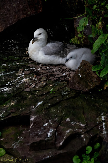 Aunque los álcidos quedaron apartados a un lado, fotográficamente hablando, observar la colosal y casi interminable colonia que llenaba todos los recovecos de los cantiles y peñascos de la isla fue absolutamente maravilloso. Por otro lado, los fulmares entretenían tal vista con sus interminables vuelos, y los págalos nos proporcionaron verdaderos momentazos a lo largo del recorrido, mostrando sus disputas vecinales (llegándonos a atacar para disuadirnos de las proximidades de sus nidos) y una gran tranquilidad pese nuestra presencia cercana, lo cual nos permitió observar al detalle a estas aves. Y por si no fuera suficiente, además, pudimos observar varios colimbos chicos, algunos de ellos incluso con pollos.